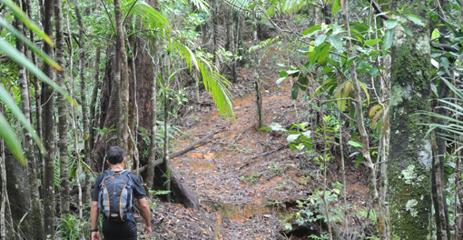 Assez longue étape forestière dans un relief accidenté et très compartimenté. Le sentier est englouti discrètement dans la touffeur silencieuse de la forêt en se faufilant entre les grands arbres. Il pénètre dans des espaces longtemps inviolés et énigmatiques. La balade peut être fraîche et agréable ou... étouffante et pénible. Mais elle peut aussi devenir dangereuse. Plusieurs franchissements de rivières deviennent rapidement impraticables en cas de pluie abondantes. Informez-vous de l'état des rivières et des conditions météo pendant les jours précédents le départ.
